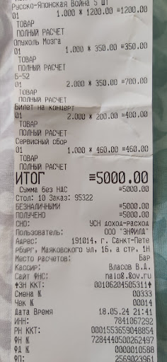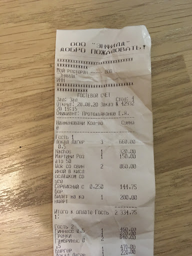 Read moreВ прошлом году заходили сюда с мужем и были в полном восторге. Восхитительное пиво и восхитительная музыка. Так что в этом году было решено отпраздновать важное событие именно здесь. Ничего, что официант забыл наш заказ а кухня работала только с 20:00. За пиво и за музыку мы бы забыли все на свете. Но когда я взглянула в чек, сказать, что я потеряла дар речи, это ничего не сказать. В чек включён билет на концерт!!!! На каждого человека!!!! По 200 рублей!!! При том, что этого не написано нигде, ни в их официальной группе вк, ни в меню, официант об этом не предупреждает. И на каждого человека считается Сервисный сбор. И об этом опять же никто не предупреждает. Ребята, что за дела? Если вы собираете сервисный сбор, это должно быть обозначено на меню большими красными буквами, либо хотя бы озвучено официантами. К тому же за какой сервис я плачу? За отсутствие половины меню и забытый заказ? Мероприятие было испорчено, благодарю. Ребята, когда вы не говорите, что включаете что-то в чек, это называется развод. Вы обманываете людей. Так дела не делаются. Особенно если учесть, что в предыдущие года...