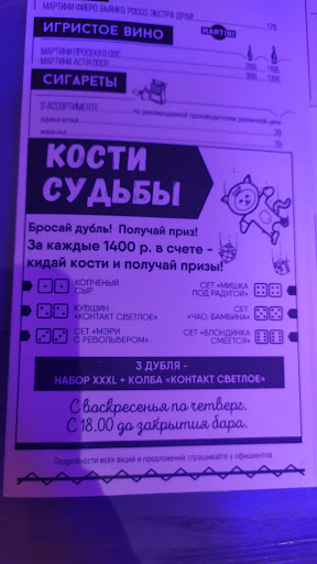 МИНУСЫ ПРИ ОПЛАТЕ СЧЕТА: Когда вы приходите компанией и садитесь за стол, то вас не разделяют. Всем все равно сколько человек в вашей компании, вы не можете заплатить сами за себя, а платите общий счет (якобы вы один стол). В приложении есть бонусы, но все эта система с огромными проблемами. Например, если действует акция «Дарим виски-колу, если ты подпишешься на телеграмм», то вы должны всем столом, например - 10 человек, подписаться, чтобы получить ОДНУ виски-колу, хотя в приложении этого не сказано. Бонусы можно списать только у одного человека, вы не можете сами оплатить свой чек и списать бонусы. Либо всем раздавайте, либо вообще не используйте, а потом они сгорят) В меню есть позиция «дуделки», которую никто из персонала не рекомендует, потому что это ерундовое курительное средство, но эта позиция в меню продолжает существовать почему-то.
