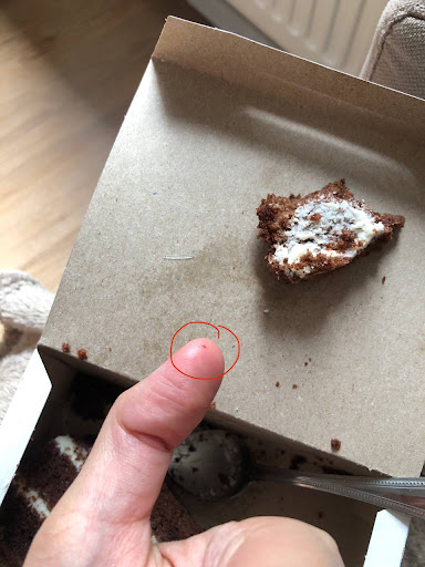 Read moreДобрый день! Люблю продукцию Вольчика, но с таким я столкнулась впервые. Сегодня я приобрела сметанник в котором мне попались осколки (по-видимому) пластик, однако им я поранила свой палец, хорошо, что вовремя заметила и не употребила эту часть торта, однако мелкие осколки я все таки съела до момента, пока не заметила другие.