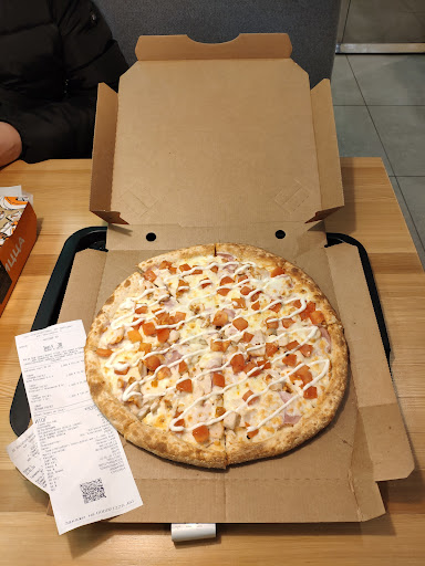 Read moreИз плюсов-приличная пицца с хорошими скидками (50% по флаеру). И ждать пришлось не очень долго. Видно, как работает кухня. Из минусов-всё откровенно ориентировано на детей в плане дизайна и внутреннего устройства. Туалет запрятан в неочевидном месте, так что либо исследуйте местность, либо спрашивайте, зато там есть 2 раковины перед кабинками. Показывали акцию с бесплатным напитком к большой пицце. Мне его не предложили. Я спросил сам-мне посеветовали "заглянуть в приложение". В итоге выяснил у менеджера, что это была просроченная акция. Затем работник докопался, что я не делаю заказ, когда я ждал заказ. И наконец, сама система слежения за очередью по чековым номеркам. Мелочь, но раздражает. Если бы я хотел такого обслуживания - заказал бы доставку. Еда приличная, но само заведение произвело отталкивающее...