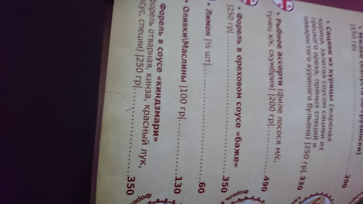 Ожидаешь от места с национальной кухней вах! Что на деле? Пришёл за стойкой бармен он же и официант (это была пятница) присел. Был день учителя - очень громко играла музыка, учителя открывались!) подошёл бармен дал два меню (напитки и основное) и пошла - я остановил её и спросил - что вы мне посоветуйте из грузинской кухни? Бармен сразу замялась и сказала что не знает что мне посоветовать? ( я спросил - ну, какие национальные блюда в Грузии? На что она только ответила - манты! Окей, говорю я, давайте манты) В ответ - манты будут готовиться 30 мин. (я ехал в кино и долго не хотел ждать) Спрашиваю - есть что недолго ждать? И попалось мне долма на вид, спрашиваю - долма сколько готовиться? Бармен - 15 мин. Ок, говорю я, её радимую и лаваш есть? Бармен - есть. Я - свежий? Бармен - ну как) (жмёт плечами) мы разогреем его вам. Ответ шедевральный))) есле бы я не попросил свежий мне бы его не подогрели?))) Попросил оставить меня пока готовят, может ещё что закажу. Дозаказал себе форель в соусе киндзмари, непробывал. Принесли долму. Что скажу - жена готовит вкусней, потому что даже она знает что долму готовят из молодых листьев винограда, потому что зрелых листьев винограда жесткие прожилки и они не жуються( тут или повор не профессионал или ему пофиг на гостей!( Второе блюдо: варёная фарель в воде с уксусом и петрушкой - не вкусно( Итог: еда не стоит тех денег что...