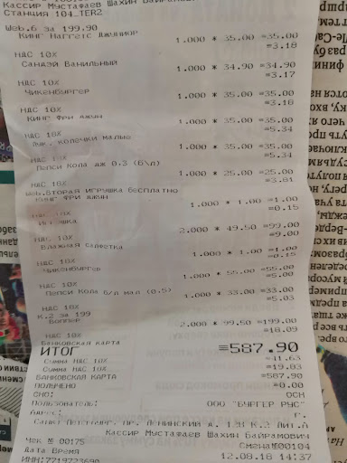 Read moreУтром и днем вполне себе заурядный бургер-кинг, но поздно вечером сходите лучше перекусить в другое место. Акция два пива по цене одного как магнит притягивает молодое быдло, нередки драки рядом. Что по самому "ресторану" в ночь 28-29 декабря был свидетелем ругани между одним из работников кухни со старшим смены и девочкой кассиром, я понимаю, сфера обслуживания это не карьера мечты и идут туда не от хорошей жизни, но дамочки из hr, не нужно совсем отбитых на работу брать! Менеджер, к слову, держался не плохо, хотя я был уверен, что тот отморозок ему точно втащит. В зале в тот момент было довольно людно, были дети. Короч отстой. И это, булки на бигкинге показались...