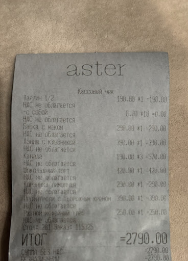 Read more18.03.25 случайно оказались в чудесном местечке ASTER на ул.Римского-Корсакова. Припарковались рядом, были места. Простая вывеска, но какое классное обеденное пространство оказалось за дверями. 17:00 будний день, но 2/3 столиков было занято. При входе нас очень тепло и солнечно поприветствовал весь персонал что нас увидел, эт прям огонь! Очень стильное просторное помещение. Показали нам на витринах десерты и провели к замечательному столику у окна в дальнем зале где готовили повара на открытой кухне. Запахов от кухне не было. Принесли меню, быстро приняли заказ, быстро принесли. Взяли два латте, американо, невероятные сырники с кокосовым кремом, конфетки, булочку с маком и морковный торт. Все невероятно вкусно. И еще что хочу обязательно сказать чтобы были понятно насколько мы довольны посещением данного заведения. Я, мой супруг и наш гость зашли сюда только потому что напротив ASTER смотрели в покупку квартиру в 49 доме. А гость, что был с нами, эт был правая рука главного католика России, и знаете что он сказал выйдя из данного заведения: мне так тут понравилось, со мной поздоровался на входе и выходе каждый сотрудник заведения, что я, наверное, куплю квартиру напротив него, чтоб чаще здесь трапезничать и поднимать себе настроение! Это самая большая похвала для ASTER. Посещением очень довольны. Очень КЛИЕНТООРИЕНТИРОВАННЫЙ...