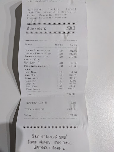 Цены: средние ни низкие и ни высокие. В счёт добавляют 5% "чаевых". Хотел оставить 10% ну и Бог с ними. Но можно хотя бы спросить заранее "не хотите ли добавить чаевые по карте" а не молча подсовывать...