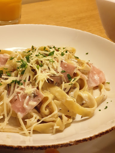 Ожидала в итальянском ресторане классическую карбонару. Даже в ресторанах иной специализации карбонара всегда была лучше, чем здесь. Карбонара здесь - это обычные макароны в сливках с невкусным беконом. Пармезан не чувствовался. Вкус соуса, который по классике должен быть из желтков, полностью затмили сливки. В меню указано, что их добавляют по желанию. Но мне "классическую" карбонару сделали изначально со сливками. В общем, похоже на кашу. Ждать, пока переделают, терпения не было. Из хорошего - ранее была здесь и ела чёрную пасту с лососем, она была вкусная. Смузи и десерты тоже. Также, несмотря на целый зал людей, которые пришлись всего на 2х официантов, как и в прошлый раз, Роман вновь приятно удивил обслуживанием. Работал быстро, с улыбкой, и...