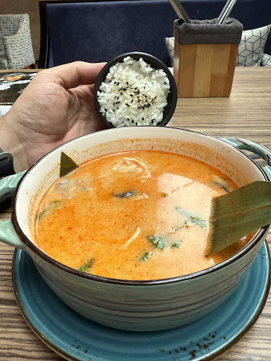 Так мечтал о вкусном Том Яме..рад был сильно когда принесли… Есть не смог…две - три ложки через силу… Даже супер голод не убедил меня это съесть. Просто какой-то суп из морского коктейля(мидии преобладали) Даже отдаленно не напомнил Том Ям. Отправьте повара в командировку Азию))) Ну или пусть сходит в ресторан где дают Том Ям )) Девушка-официант понравилась своей вовлеченностью в процесс! В остальном место не плохое(раньше было😅) Есть парковка(крытая) Уборные в норме. Цена, скажем так, бюджетная.