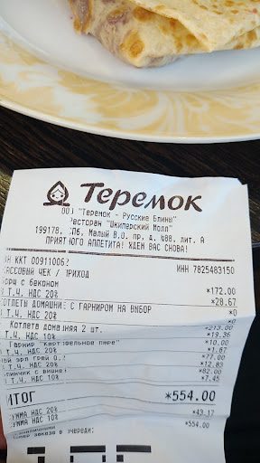 Read moreПытаюсь дать шанс теремку, а он ни в какую! Работники блаженные: принялись между собой обсуждать (без моего участия) спешу или я куда-нибудь, или готов подождать! К слову ждать пришлось долго! Непонятно, почему при таком уровне цен нет официантов которые бы приносили заказ, ведь ждать за столом намного приятнее, чем перед кассой в очереди! Уборка в зале обеспечивается одной хрупкой девушкой, которая просто не успевает!