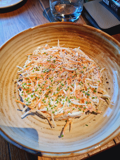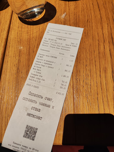 Персонал. Это было ужасно, словно нет стандартов обслуживания гостей. У официантов нет опознавательных знаков. К нам подошёл наш официант и просто молча склонился над мужем. Молчал он до тех пор, пока я не начала диктовать заказ. А я всё это время переживала, что непонятно кому диктую, что буду есть. Хотела изначально заказать тартар, везде беру его без лука и тут попросила так же. На что получила ответ "ну значит вы не будете тартар". И вопрос - это официант решил меня научить, как правильно есть сырое мясо или на кухне эту позицию заготавливают заранее? (Чего быть не должно, тк это всё ещё сырое мясо и позиция в принципе идёт из под ножа). На входе девушка очень долго имитировала бурную деятельность, ища нам стол (будни вечер). Я специально потом посмотрела и столы не были в резерве, да и вообще было занято всего 4-5 столов. Зачем-то принесли комплимент от заведения. Нет, это приятно, но мы о том, что это комплимент узнали только из чека, так как на мой вопрос официант мне ответил "вы ешьте, вас здесь не отравят".