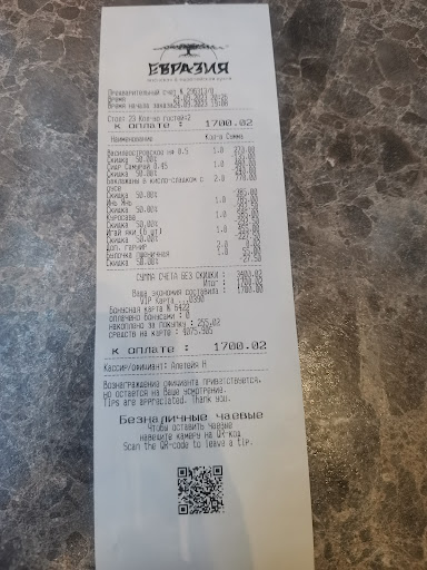 Read moreЕвразия сегодня вечером разочаровала. 1. Не гостеприимный менеджер - хостес. Официант новичек, на вопросы о блюдах ответ "я не пробовала не знаю" , ну сервис хромает. Блюда были довольно хорошие по вкусовым качествам но ожидание более 40 минут. "Вишенкой на торте" послужил хлеб, принесли булочку белого хлеба разогретого в микроволновке до состояния кипячёной губки. К слову через 2 минуты булка остыла и стала каменной. Кто вообще додумался греть хлеб в микроволновке? Подавайте уж тогда обычный хлеб в нарезке. Не предоставили книгу жалоб по первой просьбе, собственно - подошла менеджер обьяснила что булка у них откуда то приехала и была перемороженна. Книгу так и не принесла, разве не по первому требованию должны...