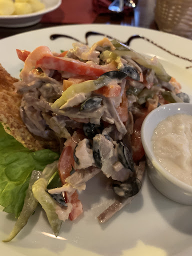 Конкретно этот отзыв подвиг меня написать салат. Так вот «цезарь с курицей» меня огорчил — кислым, отдающим, как мне показалось рыбой, соусом и огромными кусками каждого из ингредиентов. Может я привык к более утонченной (измельченной) подаче, не знаю. В общем — категорически не рекомендую. Гренки с сыром — ну тут и испортить что-то трудно, и выделится, с другой стороны. Они просто есть. Сырный соус к ним не вызвал каких-то эмоций. Пивным завсегдатаям видимо сойдет. Деревенская сковорода с говяжей вырезкой — вполне. Но если не будет пережарена, как наша. Колбаски Нюрнбергские — хороши. Взяли 2 порции. Солянка на четверочку. Консистенция и набор ингредиентов — норм. Банановый торт. Просто скажу, лучше возьмите стандартный чизкейк. По крайней мере ваши ожидания будут больше оправданы.