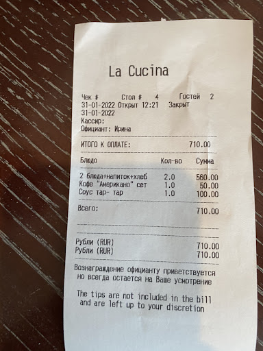 Итальянский ресторан ЛяКучина. Какие впечатления у меня остались? - спросите Вы... в целом, очень даже приятные. Шёл в ресторан, чтобы вкусно покушать. Именно качественно и изысканно. ✅ Кухня 5⃣ Советую: Суп Frutti do mare, салат со свежим тунцом, равиоли с белыми грибами и пицца Прошуто с рукколой 👍 ❎ Прайс почти Гинзовский, ценник высокий 🆗 Интерьер ожидаемый, в итальянском стиле 3⃣ ✅ Вид на Площадь Александра Невского и на р. Нева впечатляет 5⃣ ❎ Персонал и обслуживание весьма средние 3⃣ Блюдо овощи тушеные вынесли в самом конце - не думаю, что оно готовится дольше пиццы, супа и пасты. Официанты вместо того, чтобы убирать грязные тарелки со стола, стояли и трещали с барменом и менеджером; весь персонал выходил 💨 - беготня в куртках по залу 👎 ❎ Удивление в чеке- расскажу подробно 👇 Заказали чай Ройбуш из основного меню за 270руб 1л, вместо него нам ЯКОБЫ ПО НЕ ПОНИМАНИЮ в счет включили чай с аналогичным названием, но из чайной карты за 600руб. Если такой чай имеется двух видов, то официант, принимая заказ, должен был уточнить - какой именно выбрали мы. Ну или элементарно просто посмотреть из какого меню мы заказываем. Кстати, это проблема не только этого ресторана. В целях повысить счёт гостей, бывает, что официанты забивают чай дороже 😾 Но, к нашему счастью, в этот раз мы пресекли данное деяние и нам сделали возврат 💰 От факта данного культурного мошенничества остался небольшой осадок. В текущих реалиях высокой конкуренции и падающего спроса на большинстве рынков, в том числе и ресторанном, более важно поддержать долгосрочную лояльность своих гостей и клиентов, а не навариться на сиюминутном, коротком и иногда одноразовом вытресании денег.