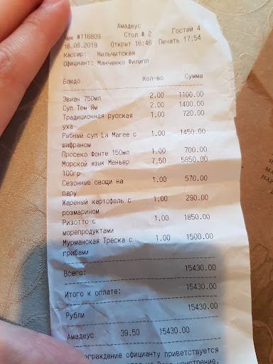 Sheer disappointment. I brought guests fron CZ and we were insanely disappointed. We ordered traditional Russian soup, but it tasted like water aka without taste. There was no Russian fish at all, but oh well. All food that we ordered we would rate 3 out of 10 but left 16,000 (almost 300 USD) for it, it was just that water cost 1,200 (20 USD) for 2 bottles. For foreigners, it is wild because abroad water is free. The best dish was a free sorbet which was served after the soups. At least the waiter spoke a little English. In short, for the amount of money we paid, food was generally really not good at all. But Putin and Medvedev came here, they probably got tastier food. Conclusion - disappointment especially for foreigners. We would be fine paying this amount of money for a good meal but the food from this restaurant was not worth it...