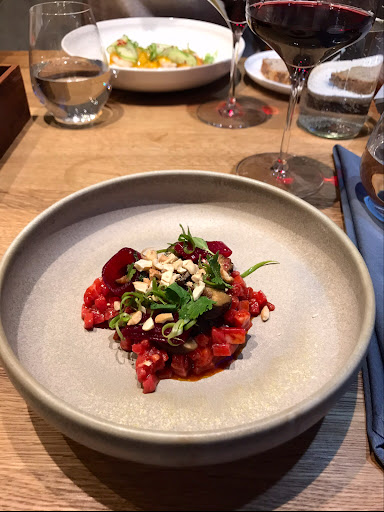 Заказ не сказать, что большой. -Тар тар из говядины с соусом из трав, нужно все обильно перемешать (по рекомендации). Любопытно, но не более. Нежный вкус мяса теряется в соусе. Ощущается только консистенция говядины. Свежо , нежно, кисловато, прохладно. Ещё раз брать не хочется. -тар тар из оленины с сулугуни, здесь вкус поинтереснее. Мясо ощущаешь вместе с кремовым прохладным вкусом. Только мясо как будто подмороженное , аж лёд на зубах хрустит. Не знаю должно быть так или нет. Но блюдо это больше понравилось, нежели. -татаки из говядины с фуа-гра. Я не любитель "фуагры" ,но каждый раз, если есть-пробую. Вкус ,все равно ,ни с чем не сравнимый. Сделано хорошо. А вот мясо , ну ощущение, что отрез (стейк мясника , очень волокнистый,не особо сильный вкус и нужно пожевать ) может быть конечно не он. Жевать нужно, как жвачку,пока зубы не сотрешь. Мне кажется это блюдо не должно таким быть, что-то пошло явно не так. Видимо косяк производства. -фуагра с грушей и ромом. Кусок фуагра очень хорошо поджарен, аромат обалденный ,а вид Ммммм🤤Жаль забыл фото сделать (хотя оно всего не передаст). Вкусно, нежно, соус отличный, 🍐 хороша. За эти деньги стоит брать, не дорого и мастерски! -Карпаччо из говядины с соусом из печеного чили. Вот это блюдо у меня останется в памяти надолго. Сколько оно вызвало эмоций. Крайне нужно брать! Острота многогранная , ей наслаждаешься. Нежное/прохладное мясо в сливочно остром соусе -балдеж. Лично для меня блюдо за которым стоит приходить. Выделю время приду за ним, и попробую что-то ещё ;)