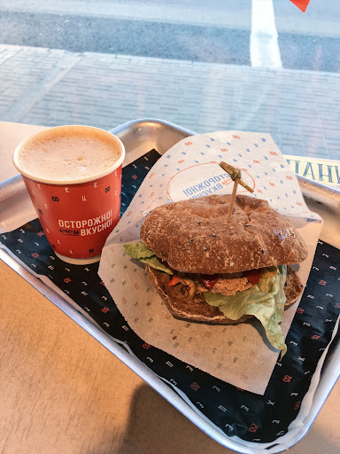 Read more"+"Выгодное ударное место. Но здесь рядом аналогичное заведение. "-" Вообще отсутствие какого-либо сервиса. Работники заняты беседой, столы не убраны, ( на фото видно мокрый стол, который нехотя протер работник). Подача просто за пределами всего, 🏚️уровень деревенского вокзального буфета. Держа за бортики оцифиант подал бумажный стаканчик с напитком, без подноса, без салфеток ...потом надо бегать искать сахар, салфетки. Жуть. Интерьер чудовищный, кругом черные пыльные трубы. Такие же пыльные окна 🎥Наверху камера, которая может заглядывать в экраны всех гаджетов, всех посетителей. На взгляд, вроде бы приличная еда...😜если удастся еду как-нибудь донести...Может быть подойдёт для школьников, но не для солидной публики, а тем более...