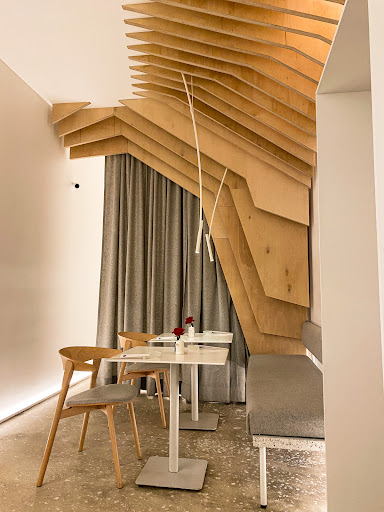 Дизайн создан известным архитектурным бюро DA Architects. ▫️2 белоснежных зала. ▫️Ключевыми элементами выступают спускающиеся с потолка деревянные панели, которые образуют волнообразный рельеф. 🔳Лаконично и красиво, на каждом столе акцент - красная роза.