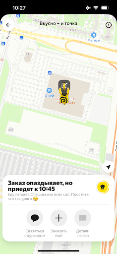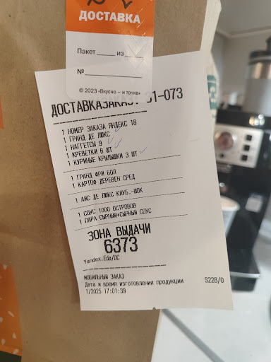 Read moreНе знаю кому притензию кидать! Но делал заказ через яеду! Заказ приготовили по чеку в 17.01,а по прилож. В 17.11 курьер еду забрал в 17.42 ! Либо в приложении мухлюют ,либо сотрудники выдали заказ спустя 40 мин, что привышает в 2 раза их регламент. с момента приготовления!!почему тогда в прил. если не забрал за 20 мин еду утилизируют?Еда была не пригодна. Скорее всего ,это именно доставка мухлююет со временем. Хотя судя по отзывам и сотрудники могли отдать испорченный продук. 1800...