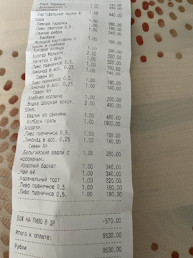 Read moreПраздновали корпоратив. Еда не вкусная и ее очень мало. Рассчитано было 1кг еды на каждого, даже половины не нашли на столе В оливье перебор дешево но майонеза! Горячее (треска с лапшой из кабачка и устричным соусом) - обычная вареная рыба как в больнице. Не могу ни на одно блюдо уверенно сказать - ВКУСНО Пиво тоже не вкусное оказалось Обманывают. Сначала заказали 1,5 пива светлого, фильтрованного. Принесли не фильтрованное. Ладно, оставили его. Позже, заказали снова 1,5 фильтрованного, и только тут официант соизволил сообщить что фильтрованного нет! В прошлый раз он просто решил принести то, что есть, без согласования с нами - интересно. Но еще интереснее, что второй кувшин стоил на 300 рублей дороже первого 😅 когда мы попросили объяснений, нам было сказано, что тут 2 литра, а там было 1,5, поэтому дороже. НО МЫ НЕ ПРОСИЛИ 2, и объем был абсолютно такой же. Официант обещал разобраться, и на этом пропал. Его напарники сказали что у него поднялось давление и его не будет) к слову, в меню нет графина на 2 литра. Проблему не решили Принимали заказы на напитки и не приносили их, через полчаса уточняли где заказ, нам отвечали «а у нас этого нет сейчас» почему сразу не предупреждали, а просто игнорировали заказ?