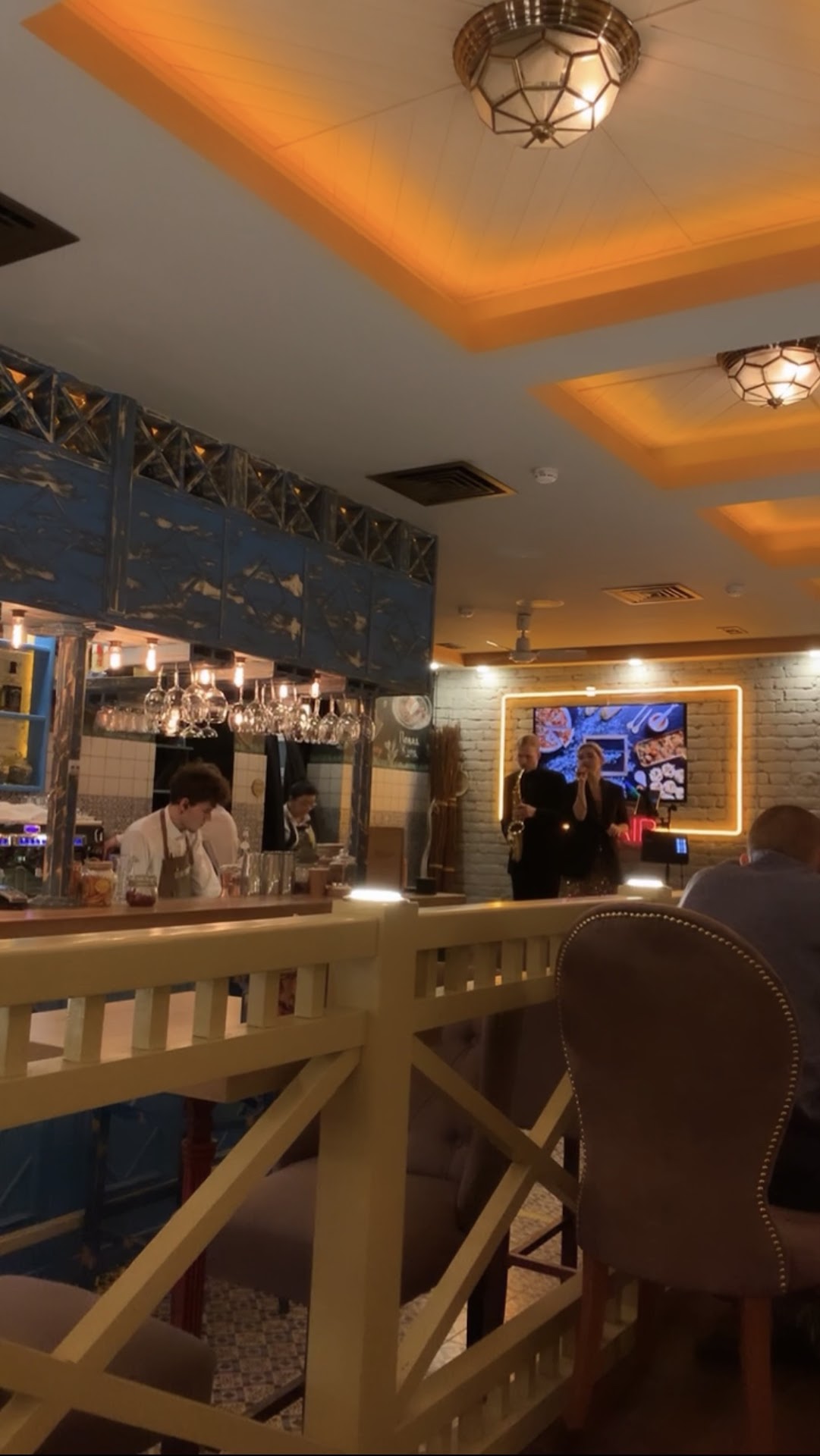 Read moreБыли в данном ресторане на мой день рождения. Скажу честно - разочаровал. При входе в ресторан находится гардероб, но никто вам не поможет повесить вашу одежду, вы будете вынуждены искать в огромном количестве курток свободные вешалки и вешать свою одежду самостоятельно, а девушка за стойкой будет лишь незаинтересованно за этим наблюдать. К моему удивлению, напитки здесь готовятся дольше, чем еда: если вы решите заказать, например, кофе с десертом, то закажите сначала кофе, а потом минут через 20 десерт, в противном случае десерт вы будете есть в сухомятку, ведь ваш кофе подадут совсем не скоро (даже, если вы о нем неоднократно напомните). При выборе ресторана, в котором хотелось бы провести вечер дня рождения, для нас было важным наличие живой музыки (вечер субботы), здесь она была только номинально: играли 30 минут, потом отдыхали 45 минут, потом снова играли 30 и снова отдыхали 45. При этом эти 45-минутные перерывы были в полнейшей тишине, вообще ничего не ставили на фон, просто тишина. На день рождения предполагалось, что дарят десерт с поздравлениями: выбирать приходится из чизкейка и тирамису, однако никаких поздравлений в свой адрес вы не услышите, даже элементарной фразы «с днём рождения», про то, что десерты в честь дня рождения обычно подают со свечкой я вообще молчу, здесь этого конечно же не было. В самом ресторане бесспорно очень уютно, однако за чистотой в зале следят неохотно, под нашим столом валялись раковины мидий, огромное количество крошек от пиццы. Заказывали среди прочего пиццу Наполи: явно жалеют рукколу и помидоры, на всю пиццу положили две малюсенькие помидорки черри, порезанные на половинки, рукколы в таком изобилии, как на фото в меню, в своей пицце вы также не увидите. Кроме того, в самом ресторане душновато. Маловероятно, что захотим посетить это...