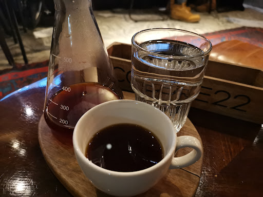 Brilliant place to have breakfast and coffee. I went there twice when I was in St Petersburg, and they were the only place who knew what I was talking about when I asked for a regular, filtered black coffee. It seems noone else in St Petersburg knows what that is, only espresso and americano. The waiter came with the coffee in a science lab glass to be poured into the coffee glass, and a glass of water always came together with the coffee. Needless to say these are coffee nerds. Also, the food was brilliant there, and the waiter was very polite and came to take away my plates as soon as I was finished. The music is refined and relaxing and by the window was an absolutely amazing book with hundreds of pictures chronicling the history of St Petersburg. It's a very easy choice to come...