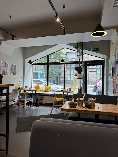 Идём по улице, видим вывеску про рамэн! Отлично подумал я, у нас есть свободный час, можем перекусить, пришли сели, 1 официант бегает на два зала, меню толи надо брать самим, то ли бегать за официантом, поймали попросили, принёс, далее, заказ на кассе, ок, нормальный формат, наверное будет быстрая выдача, ноооооооо нет, от заказа до того как его принесли прошло 35 минут, так же заказал латэ, «Меня спросили на кассе, Латэ сразу ? Да ответил радостно я, и получил своё латэ через 25 минут))) далее, перец у том яме дешёвый горький приторный без изюма, макароны в рамэн, еле еле сварились, соленный до жути, баланса вкуса нет, просто соленный трындец! Так же заказали «Моти» и если выдача еды и кофе заняла 35 минут то моти мы получили холодный в пакете собой, по прошествию 55 минут))) короче, если вам нечего делать, вы абсолютно не нагруженны никакими обязанностями и делами и у вас есть лишний час, час тридцать, что бы так себе поесть и оставить выше среднего. Отдельный респект за отмазу что официант перепутал заказы и по этому так долго, а почему бы ему не перепутать если он один бегает как ужаленный, короче полное разочарование организация 0, контроля никакого, как говорится...