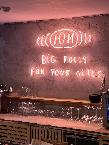 В заведении два зала: первый встречает приглушённым тёплым светом и стеной из живой изгороди, а во втором кирпичная кладка, мерч, неоновая вывеска с логотипом и длинный барный стол.