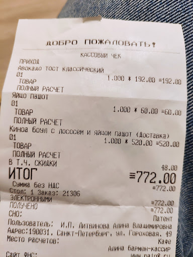 Read moreОчень давно хотела побывать, красивый инстаграм. Дак вот, пиарщики у них лучше чем еда и персонал кафе. Отмечу, что я была голодна, очень! Заказы у бара - ну такое. И проблема даже не в этом, а в том что никто не сказал, мы сидим, ждём и никого! Тишина! пока сам не пошёл и не увидел мелом маленькую табличку у кассы. Отношение все в глазах персонала- равнодушие. Как в танке, не приветливые. Еда - безвкусно, не красиво, Карл! Принесли желанный авокадо тост. Маленькие 2 кусочка не как в инсте - большой кусочек хлеба, эстетичный! А 2 малюсеньких - остатки. И авокадо на них цвета «поздняя осень Петербурга» на вкус без соли, без перца и не вкусно! Ну совсем! Тонинг брала лосось, как оказался «великомученик» без запаха и вкуса. Почти бесцветный! Просто разочарование что это стоит 310 рублей, да это 4,5 €. И я готова платить, но за вкусный продукт, а не за это.. ₽ причём уже не откажешься, оплатил до того как увидел.₽ тут начинаешь задумываться для чего оплата во время заказа. Ужасно дорого за такое, никакое отношение и невкусную не качественную еду. Капкейк жирный жир. Если бы не сахар, который перебивает весь вкус, вообще было б невыносимо. Но тут уже на любителя. В итоге: Тотальное разочарование сервисом и едой за огромные деньги. Этим отзывом хочу всех предупредить, что если надо красивое фото и вкусную еду идите в любое другое место. Одна...