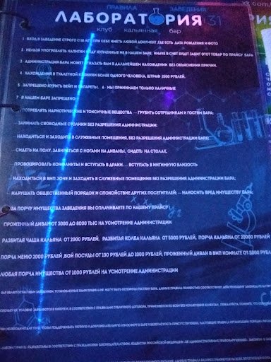Персонал не говорит "здравствуйте" или "добрый вечер", а "столик бронировали ?". Бармен позволяет себе фамильярность: переходит "на ты" без Вашего разрешения. Официанты ничего не предлагают, меню приходиться искать самостоятельно (при том что согласно их правилам Вы не можете самостоятельно занимать свободные места, но персонал не утруждает себя посадить Вас); на компанию одно меню. Точнее оно одно для всех за барной стойкой. Подача коктейлей классная, сухой лёд выглядит эффектно. Вкус у коктейлей никакой. Но справедливости ради нам сделали коктейль, которого нет в меню. Он был хорош (стоит 500₽). Бронировали столик на 23:00. В 23:02 администратор говорит, что столик занят и предлагает сесть в VIP комнату. При том что были места за барной стойкой, а вскоре и освободился обычный столик. Перемещения, как и поиск свободных мест, мы делали самостоятельно. Кальян хороший, очень вкусный. Кальянщик вежливый и приветливый. Персоналу стоит брать с него пример. Оплата только наличными. Что за бред? Я живу в маленьком городе, где в любом ларьке, даже на рынке, можно расплатиться картой. Идиотские правила заведения (смотрите фото). Бред. Официант общался с симпатичными девушками за столиком и плевал на всех в зале. Помещение находится в подвале. Контингент очень разный. Много хороших людей, но также много быдла. Туалет грязный. Полотенец нет. Столы и диваны с пятнами, при этом они с радостью Вас накажут штрафом, согласно их идиотскому регламенту. Музыка громкая, говорить достаточно трудно. Но это не минус, просто факт. Свет в интерьере интересный, но меню удается прочесть с трудом. Цены дешевые. Коктейль: от 170 до 500 рублей. Кальян: от 800 рублей. Бармен безусловно понимает в алкоголе, но комментарии про коньяки было слышать забавно. Очевидно, что молодой человек вряд ли пил некоторые коньяки, поэтому иногда можно обойтись без комментариев о том, в чем Вы не до конца разбираетесь. Записи идут в тетрадку. Установите CRM - это дёшево и удобно.