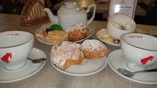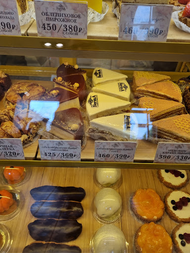 Read moreЗаведение, которое хорошо начинало, но совершенно не держит марку. В кондитерской можно брать что-то простое, вроде заварных булочек или Наполеона. И да, они как правило очень хороши. Остальные десерты зачастую настолько навороченные, что ты в какой-то момент перестаёшь понимать, зачем ты вообще это ешь. Любили сюда захаживать, чтобы поесть в кафе. Но последнее посещение, видимо, будет последним. Из меню и раньше то действительно вкусными были пельмени да бульон с фрикадельками. В этот раз вкусным остался только бульон (он действительно чудо как хорош). А в пельменях фарш настолько пересолен, что есть их едва ли возможно (причём у нас были разные пельмени: одни с мясным фаршем, другие с куриным, пересолено всё). Обстановка в кафе тоже оставляет желать лучшего. Пол грязный, валяются остатки еды. Официантка при нас протирала засыпанный крошками и корочками стол, и совершенно не стесняясь, скидывала всё прямо на пол. Даже после "протирания" чистота столика была очень условной. Очень долго и печально прямо на проходе валялась уроненная кем-то чайная ложка. Обе официантки минут 10 тщательно перешагивали через неё, пока одна из посетительниц не поднялась из-за своего столика и демонстративно не подняла её, бросив на свободный столик. Со свободными столиками тоже всё было весьма странно. Троим парам было отказано в столике под предлогом "этот столик забронирован, да и тот тоже свободен только на пол часа". Мы пробыли в кафе полтора часа, и за это время на эту "бронь" так никто и не пришёл. Из первого зала, где стоит открытая кухня с печью для пиццы и прочего в этом роде, ужасно тянет всевозможной гарью. Мы пропахли насквозь, одежду пришлось стирать. Ждать самую простую еду надо ооочень долго, словно ты в мишленовском...