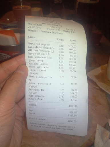 Долго думали, как будем оплачивать — в итоге решили оплатить наличкой, заодно было бы удобнее оставить со сдачи чай. как вдруг официант, когда забирал деньги, чтобы отнести кассиру произносит такую фразу: «было бы не лишним оставить комплимент официанту». Были немножко в культурном шоке. Кроме этого, на чеке, который он принёс вместе со сдачей, он написал свой номер телефона. А чего банк сразу не указал? И имя, чтоб точно на нужную карту отправили? Было неприятно — как будто какое-то вымогательство. Раньше не сталкивались с таким ни в этой сети баров, ни где-либо ещё.