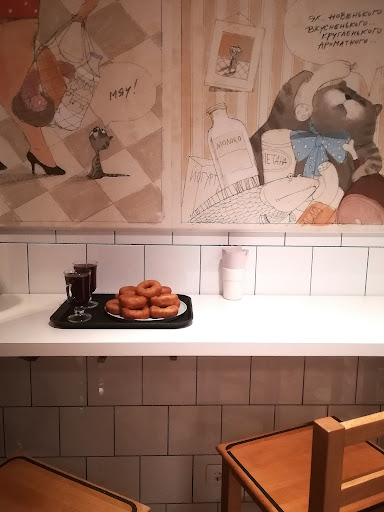 Read moreГинзу всегда не долюбливал за их пафосную подачу. Но этот проект типо растопил моё сердце!) Оформление с антуражем советской столовой, но совчиной не пахнет, в то же время. Дизайнеры продумали всё на столько, что интерьер больше похож на музейную экспозицию в самом хорошем смысле: столы с чугунными ножками, прилавок с сиропами, кастрюли прибитые к стенам. У прилавка молодые девчёнки приятной наружности, весь персонал включая уборщиц красиво прикинут в какие-то кружевные платья и тд. По-классике кофе «бочковый» (чуть переслащен на мой вкус), вкусные пышки, после которых впервые нет неприятных ощущений в желудке через какое-то время и разнообразие сладких подливок, с которыми ещё вкуснее. Заведение заслуживает твёрдую пятёрку за удовольствие как гастрономическое, так и эстетическое. Наконец-то Гинза сделала...