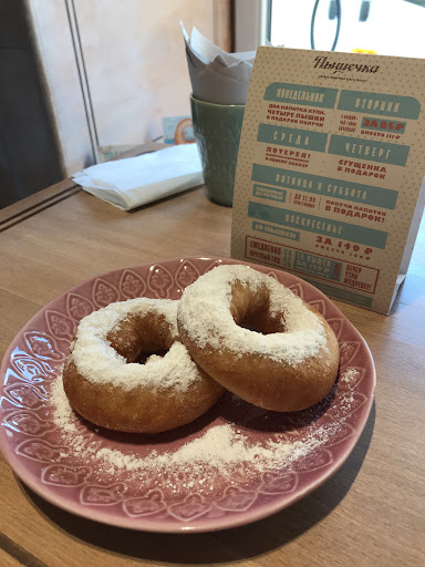 Read moreОчень вкусные, тёплые, и не жирные пышки! Немаловажно также то, что у пышек здесь не ощущается вкус масла, который бывает в пышках других фирм, и иногда очень портит впечатление. Цены низкие, одна пышка стоит всего 19 рублей, а чашка чая 40 рублей. Очень порадовало то, что на столах специальные есть специальные бумажки, чтобы брать пышки, и руки все равно оставались чистыми. Стены отделаны глянцевым кафелем голубого и белого цветов. В качестве украшений присутствуют постеры с различными сюжетами, в центре которых находятся пышки) Каждый день до 11.00 действуют разные выгодные акции на наборы пышек. Вечером также есть акция на пышки. Теперь это моё любимое место, где можно насладиться...