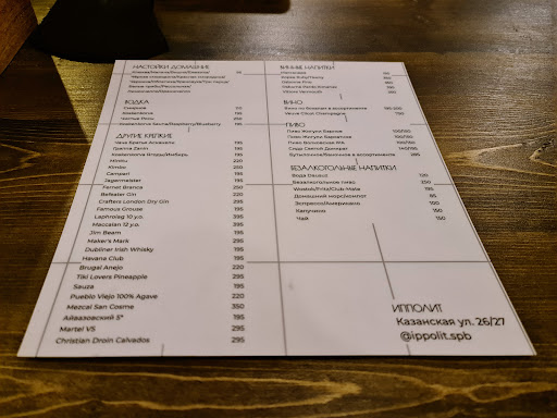 Отличное место! Самое ценное, что есть в этом баре - это его сотрудники! Ребята действительно любят свою работу! Бармены могут поддержать любую беседу, включить классную музыку, создать неповторимую атмосферу. Отзывчивые, открытые и веселые парни. Один из них (брюнет, имени, к сожалению, не помню) даже работал в некогда небезызвестном баре "Дом быта" на Разъезжей, 12, соответственно, ребята знают, что делают. Помещение рюмочной не большое, но и не крохотное. Пространство органично разделено на три зоны - прихожая, по совместительству застекленная кладовая (за широким стеклом прячется огромный стеллаж с фирменными настойками), санузел (коих два) с красиво оформленным местом для "посмотреться в зеркало, припудрить носик", и основной зал. Интерьер новый, свежий. Минимализм в мебели (например, стулья бренда Delо Design) уместно сочетается с советской посудой (тарелки, по крайней мере, советские, или выполнены в стилистике эпохи СССР, насчет стекла - не уверена). Место кажется пустоватым, потому что очень мало деталей интерьера, но это вполне нормально для совсем недавно открывшегося заведения. Уверена, рюмочная наполнится еще разными вещицами, которые будут соотноситься с культурой заведения. Культура здесь, безусловно, присутствует, за что выражаю огромную благодарность сотрудникам. Нечасто сейчас такое встретишь. Прямо у входа гостей встречает изображение, собственно, Ипполита - одного из основных персонажей к/ф "Ирония судьбы, или С легким паром!", а рядом с изображением висит тру кожаный портфель родом из СССР, прямо как в фильме. В итоге: культура присутствует, настойки вкусные, места много - хватит всем, сервис - выше всяких похвал! Правда, растений в рюмочной маловато, помещение будто не дышит, но в целом - место на твердую 5! Спасибо, ребята :) Крайне рекомендую к посещению!