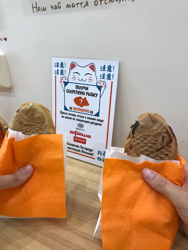 Read moreС заведением "Тайяки" я познакомилась ещё три года назад, когда впервые завернула на один из миленьких переулков Петербурга. Уже тогда мне очень приглянулся этот уютный уголок японской выпечки. Прошло столько времени, и я вновь появилась перед прекрасной вывеской и небольшими ступеньками, ведущими к дверям Тайяки. Кафе очень изменилось, стало ещё интереснее. Маленькое пространство смогли обустроить практично и весьма уютно. Интерьер достаточно простой, но гармонирующий и приятный. Оранжевые стульчики и салфетки сочетаются с логотипом. Высокие столы у стены не занимают много места, поэтому отлично вписываются в интерьер. Напротив расположена стойка, где можно сделать заказ, за ней - кухня, где готовят те самые рыбки. На стене над столом висят фотографии из Японии, а также нарисована карта этой страны. Что же насчёт самого главного, этой чудесной выпечки - я с первого укуса влюбилась в японское лакомство. Мало того, что рыбки выглядят чудесно, на вкус они ещё лучше. Я брала рыбку "банана-нутелла". Тесто было воздушное и приятное, а начинка - очень горячей, так что берегитесь! Отдельно хочу отметить, что персонал здесь очень дружелюбный. Улыбки девушек располагали к себе, а маленькие подсказки по меню и быстрое выполнение заказа не могли не порадовать. По всему кафе витал чудесный аромат свежей выпечки, а людей почти не было, не смотря на вечернее время буднего дня.