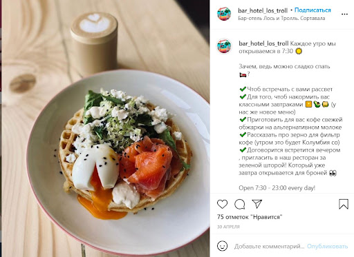 На второй день заказала вафлю с лососем, что сказать, вафля съедобна, но особо удовольствия мне не принесла, не стоит своих денег(390 руб). По фото в инсте и в отзывах должна была быть с яйцом пашот, на деле был скрембл, поэтому мне показалась суховатой. Лимонад без льда из детского меню ни о чем, на вкус кислый очень, да и сам по себе очень странный. Как будто в морс добавили газированную воду. Также заказали мак энд чиз из детского меню, на вкус обычные макарошки в сливках сверху с сыром потертым(который не расплавлен), на вкус нормально, но на вид(макароны были бантики) и вобще отдаленно похоже на оригинальное блюдо.