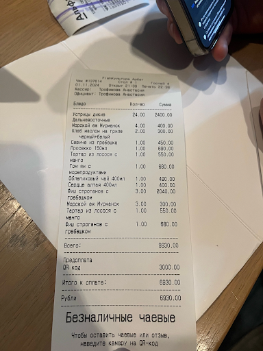 Read moreМного раз ходила в это заведение в компании семьи и друзей, раньше всё устраивало, но после посещения его с друзьями 01.11.24г в 21:30 все впечатления сошли на нет! ВСЕ 4 ЧЕЛОВЕКА ОТРАВИЛИСЬ, так плохо мне не было никогда, все симптомы НОРОВИРУСНОЙ инфекции, ресторану абсолютно всё равно, он просто уходит в игнор и не берет трубки, пришлось дозваниваться в сетевой ресторан на Покровке, там меня заверили, что мне перезвонят и решат проблему, вернут деньги за «ужин», но со мной так НИКТО и не связался! До этого же мне предлагали «извинительный ужин» у них же в заведении, после отравления у них же))) Наверное персонал не в курсе, что представляет из себя норовирксная инфекция, раз решили предложить людям ещё один сомнительный ужин! После посещения ресторана я уже неделю не могу нормально жить, есть и работать, ресторан не выходит на связь и просто ушел в игнор, и утверждает, что он не виноват, так как устрицы живой организм и их сложно проверить! ЭТО ПОЛНЫЙ БРЕД вы обязаны продавать качественную продукцию проверенную на содержание вредных болезней, прежде чем допускать её до клиента! Руководству ресторана полностью плевать на своих посетителей лишь бы платили, а что с ними будет после не их дело! Отвратительное место, желаю скорейшего закрытия и поесть свои устрицы самому...