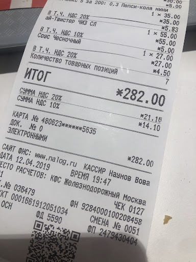 Read moreНаходится по дороге на Москву. Разворот от Москвы в 300-350 метрах. Есть kfs-авто. Заказы принимают дистанционно, у стойки. Но каждый раз что-то, да не так. То никто не отвечает, то для заказа нужно к окну подъехать. Подъехал к окну, а мне машут из окна выдачи, подъезжай, мол. А там уже и выдача и оплата. А заказ не принимают. Пару раз игнорировали просьбы, типа 9 крыльев на одной косточке, или пепси без льда. Терминалы для заказа, внутри, часто...