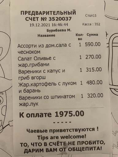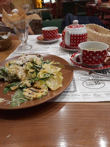 Read moreВсем добрый вечер!Сегодня с подругой были в легендарной вареничной,купились на рекламу....находится она напротив знаменитого чайного дома,о нём я писала вчера.Варенники были ужасны ,не горячие,толстенное тесто,в магазине варенники с таким тестом не часто встретишь,брала варенники с капустой и грибами..начинка невнятная грибов не нашла в ней,одна капуста с том.пастой и сверху абсолютно жёсткий жареный лук..салат из овощей с соусом из печеного перца-не вкусный с горьким послевкусием из овощей пережаренные кабачки на гриле и огурцы!Чай заказала Алтайский на травах из 7ми заявленных трав разглядела 2вида...вообщем ужин не удался.Подруга заказала уху,она оказалась чуть тёплой пересоленой и вдобавок в неё положили помидоры и оливки...зачем?Обслуживание-официантки выглядели уставшими оно и понятно в 9ть вечера ..целый день видимо на ногах..доброжелательности посетители у них не вызывали.В конверте где принесли счёт лежит карта с сотовым телефоном официантки для чаевых.Десерт подруга заказала орешки со сгущёнкой на фото одни,принесли магазинные посыпанные сахарной пудрой.В целом данное заведение...