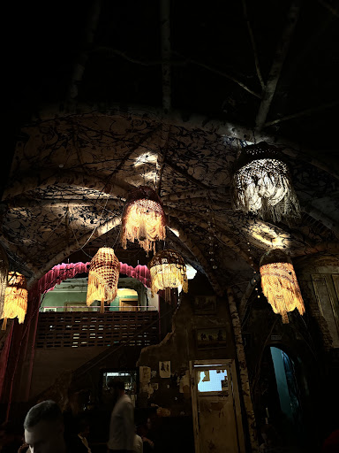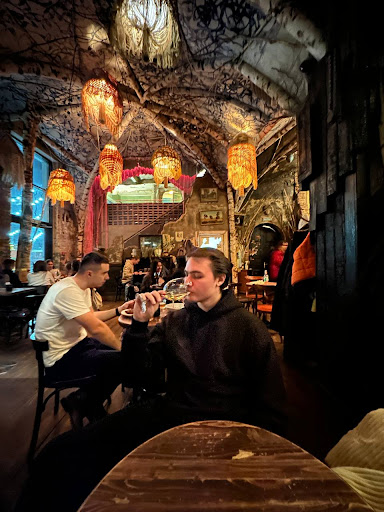 Crawford на связи) Очень хотел найти в Москве какое-нибудь необычное место с более менее адекватными ценами, что могу сказать, такое место было найдено) Интерьер... Это самый необычный бар, который я только видел, выполнен в атмосфере старой русской сказки. Много всего намешано - и древнерусский стиль с берёзами, корнями на потолке, различными арнаментами старых изб, а так же немного стиля питерских коммуналок - обшарпанные потолки, старинные антикварные шкафы, мебель и высоченные потолки. В заведении есть 2 яруса, но на втором находится только одно место, но интересное, вместо привычных кресел там ванная с вырезом, в которой можно сидеть и туалеты. Мы сидели в самом центре заведения, недалеко от бара. Играет интересная музыка, необычная. Цены средним - 500-600 руб за блюдо. Я заказал трюфельое шоколадное мороженое за 450 рублей, очень вкусное, красиво подаётся и разные бокалы вина. Вино такое себе, не прям вау, но пить можно, стоит от 350 рублей. Есть шоты, пиво и подобное, все так бар ) электронки курить можно. Сервис тоже непривычный, все напитки отдельно оплачиваются на баре, а вся кухня у официантов. Вобщем искателем необычной атмосферы точно советую посетить...