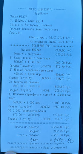 Read moreБыли на обеде в будний день. Бизнес-ланча нет, но действует скидка 50%. Не знаю на что они рассчитывают без неё, так как по полной цене блюда весьма посредственны. При расчете попросил списать бонусы. Официантка не предупредила что в этом случае скидка уменьшается до 30% и выгодность предложения теряется. Обслуживание долгое учитывая небольшое количество людей. За 40 минут к ним ещё пришло только 2 человека на веранду. Возможно тоже из незначащих)) В общем были тут в последний раз. При наличии в радиусе 500 метров ресторанов Ян примус (отличный бизнес-ланч) и За горами (тоже скидка на основное меню, но оно доступнее), Охара (неплохой по своей цене бизнес), я не знаю что сюда может...