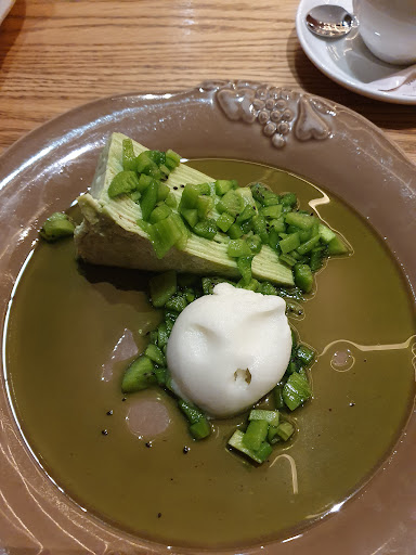 Шашлык был очень вкусный, жареная картошка не очень. Сезонный лимонад из арбуза был восхитительный. Блинный торт из матчи был тоже вкусный, но Чайхона изменила рецепт. Раньше этот торт подавался с изысканным мороженым из матчи и фруктовым соусом. В этот раз мороженое было лимонным а соус яблочный, на вкус это всё было очень химическое и кислое (очень на любителя).