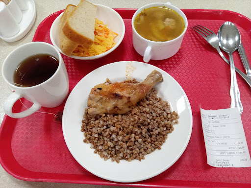 Очень хорошие цены. Хороший интерьер. Цены нормальные. Думал, будет дороже. Кафе написано. Раньше тут была столовая. Как и раньше, готовят очень вкусно. Вчера с сыном обедали. Взяли два комплексных обеда. 149 р всего. Туда включено было: гороховый суп с тушонкой, очень вкусный, макароны с боьльшим шницелем, салат - венигрет, чай и 4 хлеба....