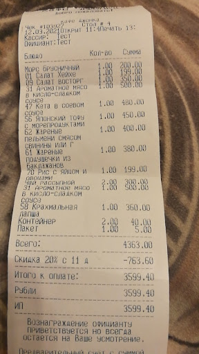 Read moreЕда вкусная, это главное. Но есть два "но". Первое. Заказывали на вынос 6 блюд. Забрать планировали через два с лишним часа, время оговорили сразу. Однако когда пришли забирать, прождали еще минут 15. Второе. На дверях объявление о скидке в 20% с 11 до 16 часов. Но не сказано, что на вынос она не действует. А это так,...
