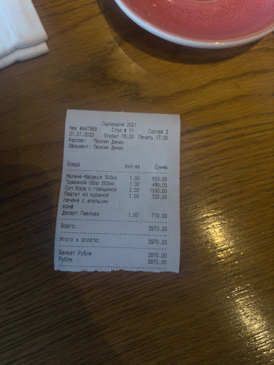 И немного про обслуживание. Официант вынес нам два борща и паштет, еще был заказан десерт, его пришлось просить вновь, напоминая. После того как вынесли десерт, официант перестал подходить. В смене было 4-5 официантов, явной «запары» в зале не было, посадка не была полной. Персонал собрался на хосте и весело хихикал 👍🏼 Тарелку с десертом забрал другой официант, ему я сказал обратную связь по десерту, о том что безе в «Павловой» ужасное. На что он спросил - ужасное? Я кивнула головой, так как разговаривала по телефону и официант удалился. Ну да ладно, просто это один из моих любимых десертов, часто заказываю его в разных заведениях, а тут фиаско. Чтобы попросить счет официанта пришлось искать, наш официант не подходил к нам. Расчет был по карте, фискальный чек был не отдан. Официант забрал его вместе с терминалом. Возможно линейные сотрудники не в курсе о размере штрафа, за не выдачу фискального чека. Если вы хотите себя позиционировать как ресторан, то будьте так добры поработать над этим и поработать со своими сотрудниками. Помня о том, что ресторан это не только про еду, но и про гостеприимство, концепцию, комфорт, атмосферу, отношение к гостю в целом . А пока, отсутствие гостеприимства и заботы отбивает желание возвращаться...