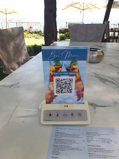 Растянутые футболки официантов. Меню сокращенное потому что сегодня концерт. Нет чая, нет кофе. Из НЕ алкоголя предложили ред бул, воду, кока-колу, сок. Депозита 5000 руб. за шезлонг не хватит на напитки, или не будешь знать что взять покушать (в итоге салат да пицца).