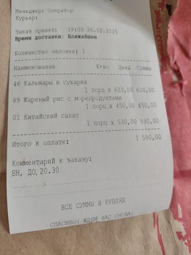 Ну что сказать ..... Хочется пожелать этой доставке усовершенствоваться и усовершенствоваться .... Блюда есть можно , но не вау , особенно если сравнивать с другими ресторанами китайской кухни Иркутска . Доставку просила на 18:00 , но сказали в это время не смогут привезти и предложили два варианта на 17:30 или 19:00,выбрала 17:30 ,пришлось отпроситься с работы и лететь домой ,чтоб успеть ,а в 17:30 девушка звонит и как ни в чем не бывало говорит о ,чудо , мы как вы и хотели ранее привезём вам к 18:00 )))) Лихо отмазались от опоздания . Далее по еде Ну так .... рис особенно удивил по фото и описанию Жареный рис с креветками, морковью и яйцом ,а по факту сверху было три микроскопических креветки и в остальной массе крабовые палочки - это жесть . Салат более менее вкусный был . Язык .....это обычно самое вкусное блюдо в китайской кухне для меня и имено по нему я сужу умеют или нет , в случае с данным рестораном это был язык со всякими жилами на вид не приятными и просто тушеный , как я это делаю в русской кухне , не понравился от слова вообще ((((( Свинина в кисло-сладком соусе кубиками тоже фигня,как десерт очень очень сладкая , совсем про соль забыли и приправы . Кальмар на сковороде как суп , много овощей и соуча и совсем чуток кальмара . Веревочки тоже как суп , но более менее вкусно ,пряно . Жареная курица в крахмале и лавровым листом - это очень очень много лука и лаврового листа ,который попадался не цельными листами ,а мелкими , замучилась выбирать ,чтоб случайно не съесть . В общем из разряда заказал на пробу и не...