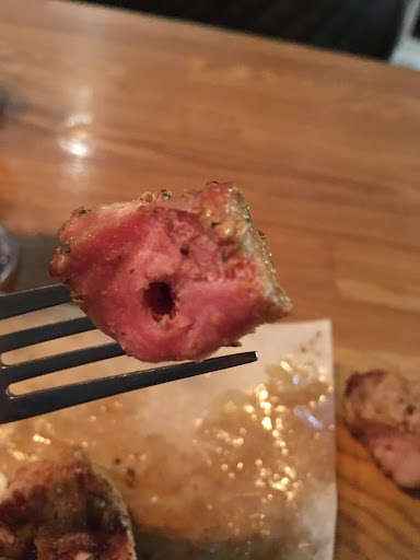 В отношении приготовления можно сделать серьёзные замечания. Пришли вдвоём, заказали 2 салата, стейк, лапшу и чай с лимонадом. Странно, что салаты нам принесли раньше напитков, но это не суть важно. После салата официант принёс лапшу и поставил её передо мной(хотя она была для мужа). Потом, минут через 20, принесли стейк. Спросили куда поставить - я, говорю мне. "И это тоже вам?". А я что, виновата, что он все блюда передо мной ставит, не спрашивая, кому они. В филе-миньон один кусочек был полной прожарки, а второй medium well(просили полной). Подозвали официанта - девушка нам прежложила дожарить этот кусочек. После "дожарки" мясо стало горелым, с горьким привкусом. Решили заказать ещё штрудель и панна-коту. В штруделе нашли волос. Ну это уже слишком, по-моему.