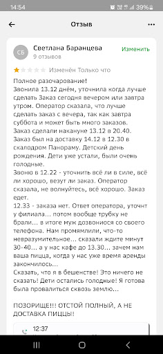 Отвратительное отношение операторов!!! Сделала заказ заранее на 20.00, позволили подтвердили , сказали заказ принят , в 20.10 звоню , 10 минут не могли найти заказ , сказали свяжется с курьером , еще через 10 минут позвони сказали что забыли про наш заказ и могут доставить через 1,4 часа Праздник детям испорчен, все сидят голодные с пустыми таблетками, на мои возражения что так не делается и праздник закончиться через час , меня поставили перед фактом что помочь больше ничем не могут, хотите раньше приезжайте сами . Мы нашли кто съездит , на что оператор опять сказал что готовят 40 минут и нет теста , после моих убеждений сказали 25 минут , приехали через 15 вежливо спросили скоро ли будет заказ , на что опять дернулись и недовольная девушка сказала что ей только позвонили и ждать 25 минут , отдали только через 45 минут ! После обещаных 25! Мероприятие испорчено ! Как и впечатление о компании , в которой постоянно заказывали ! Сама предлагала решения , как нам получить заказ ,Операторы никак не пытались решить проблему, сказали хотите пишите отзыв, мы вам больше ничем...