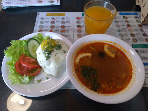 Read moreПришли с семьёй в обед,были проездом в Иркутске, кафе было забито,но почему то дальняя часть зала была ограждена и туда не пускали, не хотела с 4-х месячным ребенком сидеть около дверей,но выбора не было, искать другое времени не было,это кафе нашла в инете,отзывы хорошие,вот и решили перекусить.Заказ приняли быстро, но ждали долго позы,мы с мужем заказали позы рубленные, детям фри и по чебуреку, доча заказала блин с ветчиной а я салат из фасоли. Чебуреки принесли минут чз 3, затем я увидела что за соседний столик принесли позы,хотя они по шли на минут 10 позже нас, дети уже ъели чебуреки и соответственно ждут фри,но ни фри ни поз,ни салата нету. Я подозвала нашего официанта( у сожрал не обратила внимание на бейдж),он сказал что ни может подойти так как на кухню нужно срочно идти, ок думаю, откажусь от всего что нам ещё ни принесли и всё тут, но тут этот официант подходит и говорит а в чем собственно дело,я ему объяснила что нас кроме чебуреков ни чего ни принесли,он как так,минуточку,и пошел наверное на кухню, вышел уже с двумя тарелками фри, в позы до сих пор нет( кое как мы их дождались, позы очень понравились за это повару СПАСИБО! Собирались уходить уже и тут я увидела в чеке салат) короче принесли нас его после очередного напоминания ( И конечно же я его уже не хотела есть поэтому попросила мужа помочь. Так что как то вот так мы покушали в...