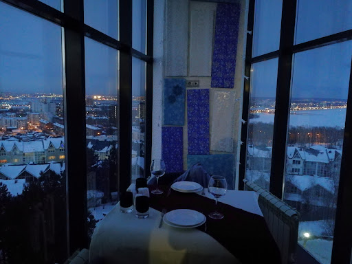 Заказывали с мужем всеми распиареный VIP стол на двоих. Выйдя из лифта нас встретила приятная девушка, проводила за стол, и мы честно сказать были удивлены видом, украшением стола (были расставлены уже зажжённые свечи, лепестки роз, красивая сервировка) ничего не предвещало беды, мы, довольные тут же открыли меню и стали выбирать салаты, горячее. Я выбрала салат Цезарь, муж- салат с бужениной, на горячее взяли телятину велингтон и мясо по китайски, ну, что сказать, проведя время в ожидании салатов (30!!!) Минут, невольно начинаешь замечать заляпаные окна, грязные полы, в туалете вообще не оказалось полотенец, даже вид и милая официантка не смогли перекрыть этот позор, стулья, на которых сидели все обшарпанные, кухня, честно сказать, не впечатлила, мясо было не первой свежести, порядка 5 вин предложенных в карте бара не было в принципе. В общем, остались немного удивлены что в таком замечательном месте такие невкусные блюда, хоть и не высокая цена. Такое ощущение, что руководитель ресторана ранее заведовал столовой. Придя домой и начитавшись отзывов, нисколько не удивились, такое ощущение, что отзывы пишут сами работники, обратите внимание на отзыв ниже некой Анжелики :фотография сделана явно не в этом ресторане, и похоже самим работником этой забегаловки. С мужем остались крайне недовольны Уважаемое руководство! Обратите внимание куда катится...