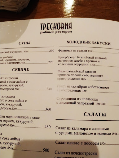 Read moreОтвратительное кафе и дело даже не в том что там обстановка как в столовке, а в том что там отвратительное обслуживание, можно долго ждать официанта, пока у вас примут заказ, всего того чтобы принять заказ она показывала бурную деятельность, вытирая одной тряпкой и стол за которым едят и стулья на которых сидят и на которые ставят неизвестно что. Потом подошла заведующая вида Мийи Уолис (жена Марселаса по фильму Тарантино "Криминальное чтиво") и явно не здорово кашляя, в нашу сторону при этом приспуская маску чтобы не кашлять в маску, а на нас, соизволила принять у нас заказ, который в течение минут 15-20 так и не принесли, кроме двух бокалов вина. Хотя люди пришедшие позже нас минут на 10 уже бодро кушали супчик. Не могу понять почему эта "замечательная" команда официантов так себя вела?! Попросил официантку принести нам хотя бы суп, который давно уже пора было принести, официантка в своей манере сказала минуточку и схватила тряпку и опять стала протирать столы и стулья одной и той же тряпкой. Когда у нас уже не осталось терпения, ждать и смотреть это глупое представление, мы встали и подошли закрыть стол и оплатить вино которое даже и не пили, но нам его принесли, бармен стал выяснять за что я нас брать деньги, показалась официантка с супом и удивилась, не поняв почему же мы уходим... У меня вопрос, зачем вы там работаете, если не умеете делать свою работу? После неудачного ужина в этом заведении мы пошли в соседнее заведение и очень прекрасно покушали, где обслуживали прекрасно, в отличии от заведения "Тресковия". Большая просьба к заведению найдите...